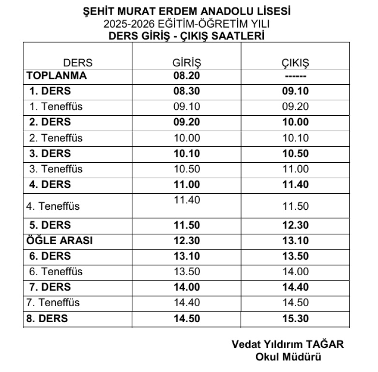 2025-2026 EĞİTİM-ÖĞRETİM YILI DERS GİRİŞ VE ÇIKIŞ SAATLERİ